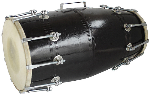 A Dholak may have traditional lacing / turnbuckle tuning depending upon whether it is a traditional one or a modern version. It has a simple membrane on the right-hand side. The left-hand membrane has a special coating on the inner surface. This coating is a mixture of tar, clay and sand which helps to lower the pitch and creates a well-defined tone. Dholak is a popular instrument in film music and qawwali.